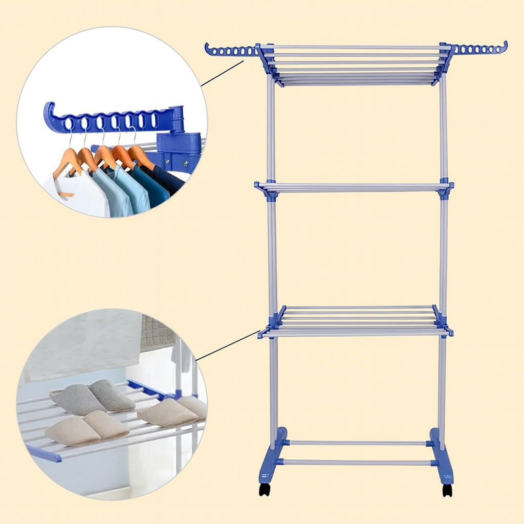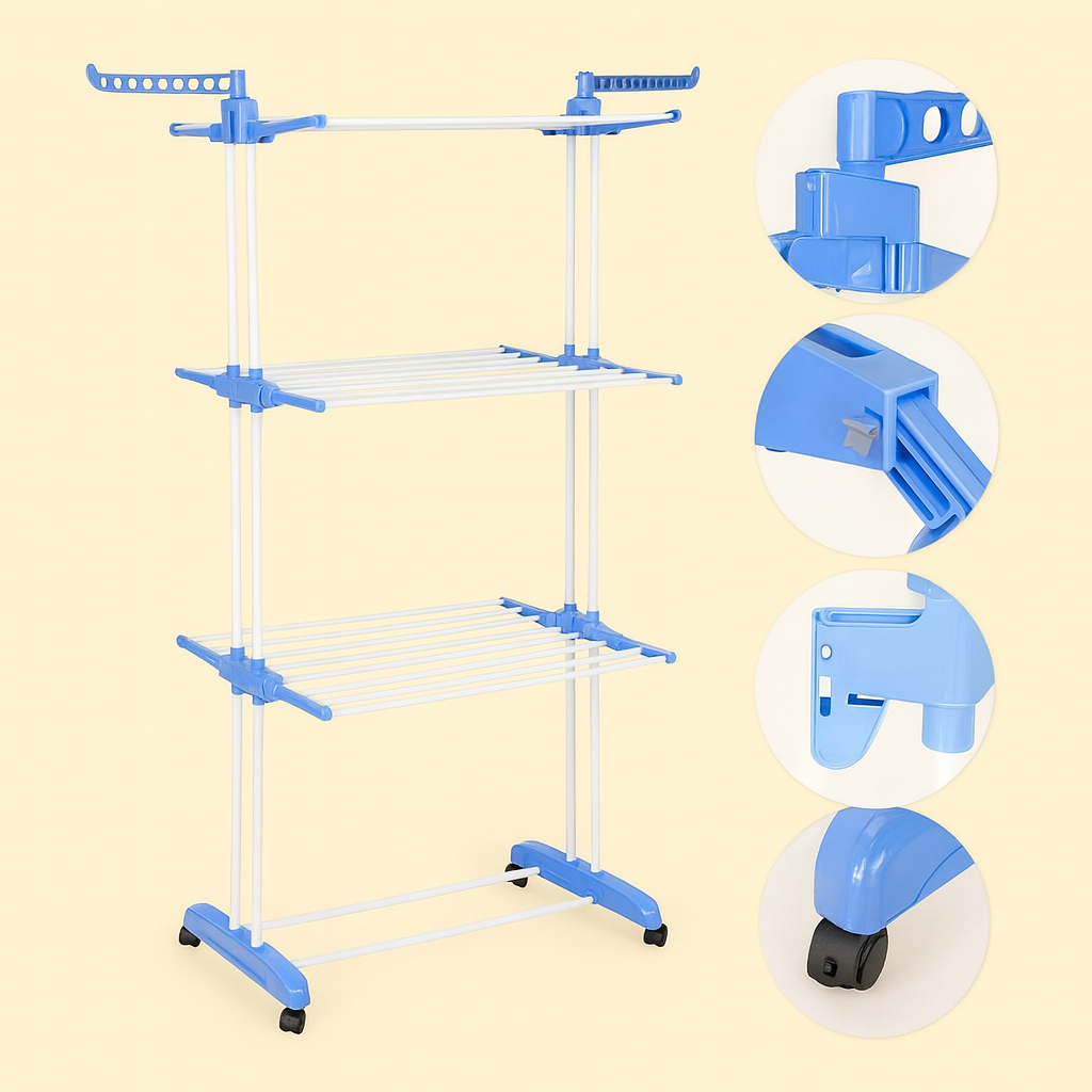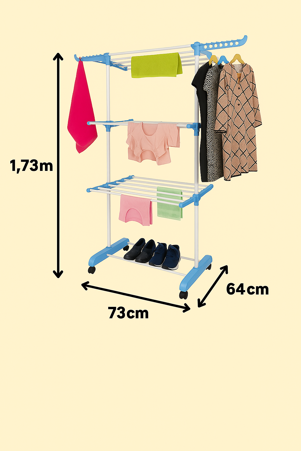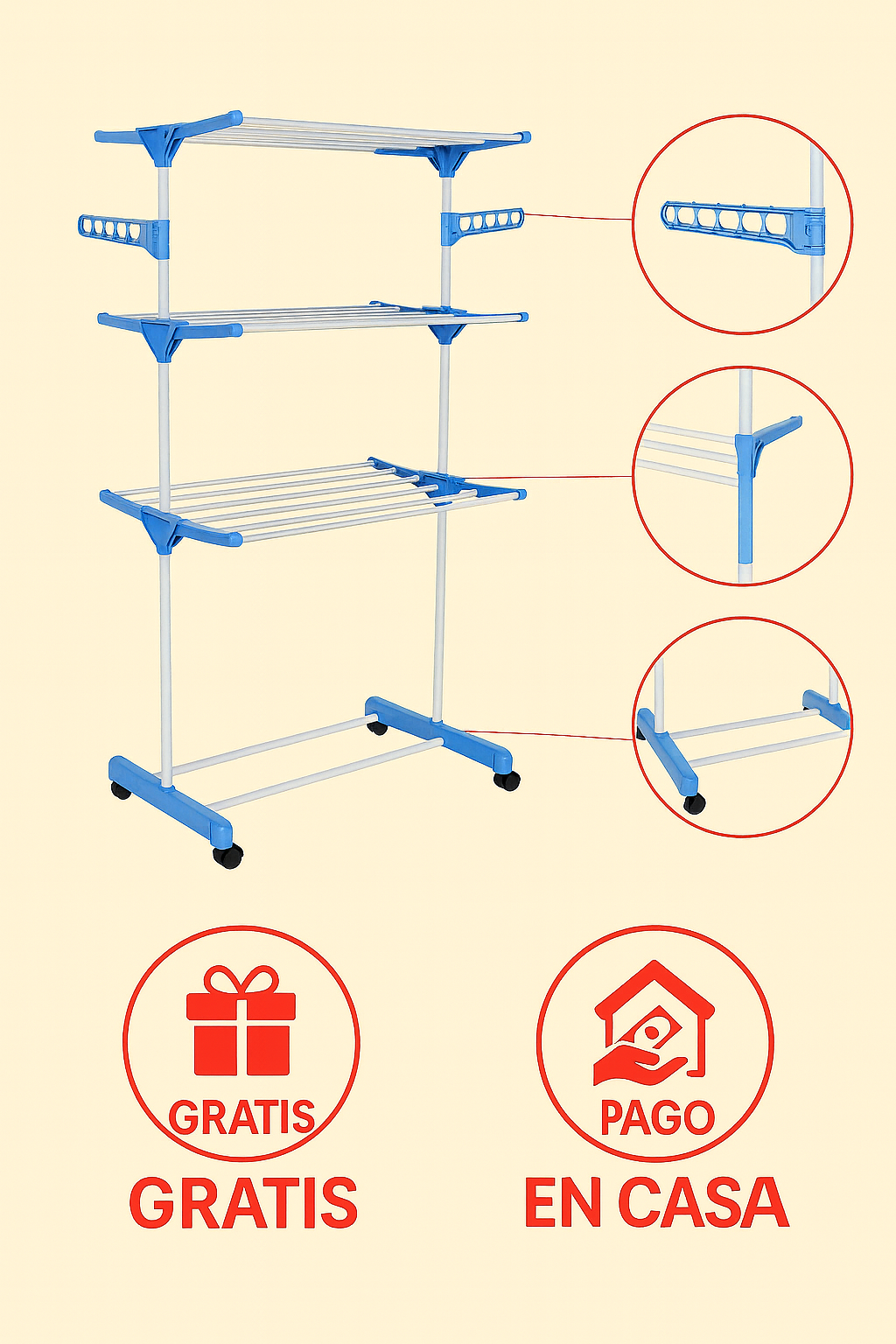 TendeXpress portátil permite colgar mucha ropa ocupando poco espacio, ideal para departamentos y lugares reducidos. Práctico y eficiente para secar prendas dentro de casa sin depender del clima. Es multifuncional con estantes plegables ruedas y barra extensible. Resistente, práctico y compacto para secar ropa sin ocupar espacio.